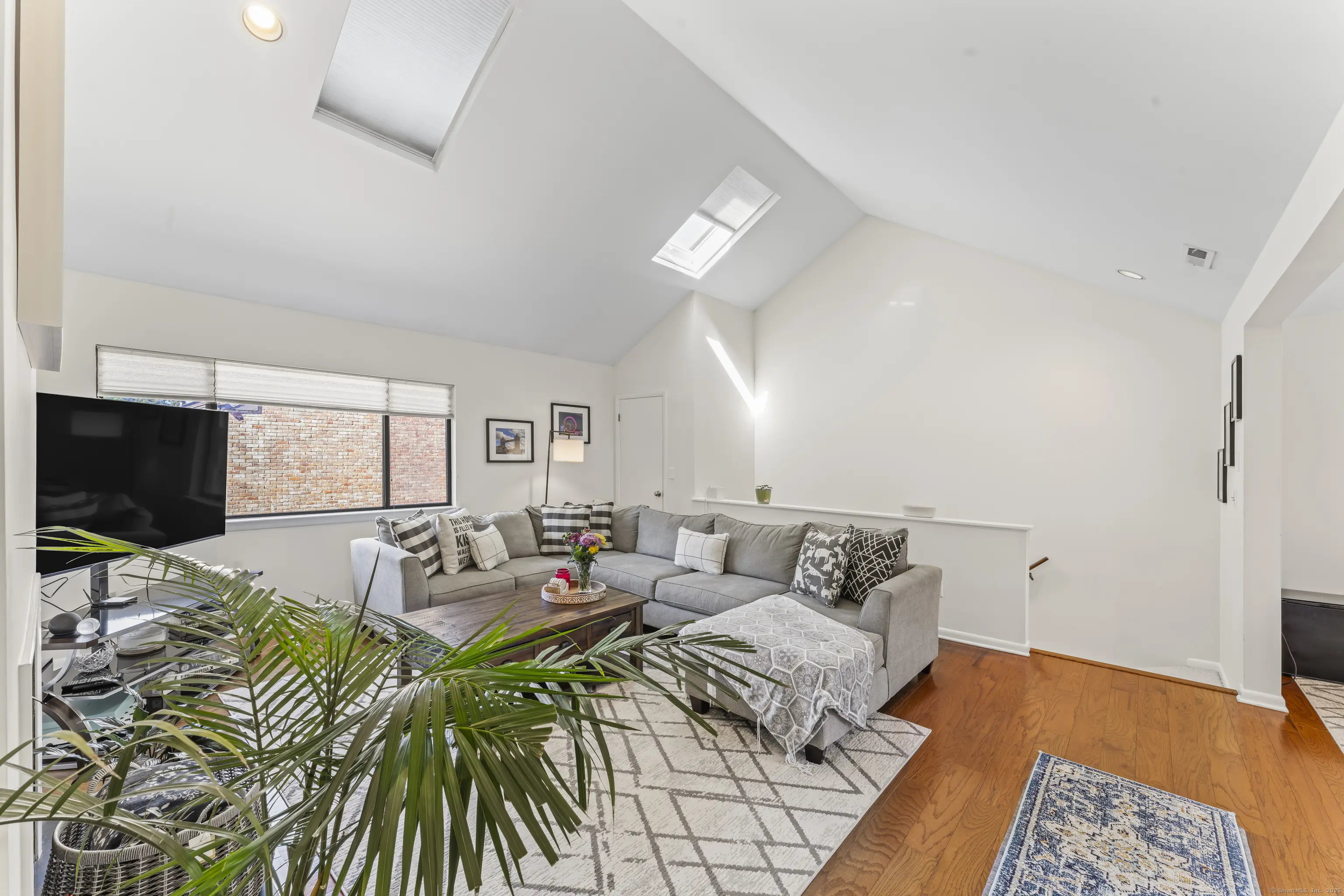 Welcome to Chesterfield! This sought-after gated community offers 24-hour security gatehouse and a prime location directly across from Ridgeway Shopping Center with shops, gym, and grocery store, plus easy access to I-95, the Merritt Parkway, and Metro-North. This bright, spacious unit has been beautifully updated throughout. The living room features gleaming hardwood floors, skylights, a fireplace, and soaring ceilings, with an adjacent dining area and kitchen boasting stainless steel appliances, granite counters, stone backsplash, and in-unit washer/dryer. Step out to your private balcony for fresh air and relaxation. Down the hall are two generously sized bedrooms and two renovated baths, including a primary suite with double closets and an en-suite bath. In summer, enjoy lounging by the pool or take a short walk downtown to experience Stamford's shops, dining, and entertainment. Two unassigned parking spaces are allowed per unit.